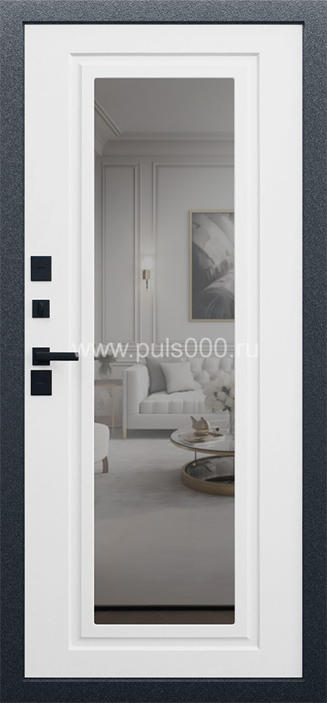 Металлическая дверь входная белая с зеркалом и терморазрывом ZER-126 может быть произведена под любой размер проема и в любом цветовом решении. Также возможно изменить параметры конструкции и комплектацию замков.